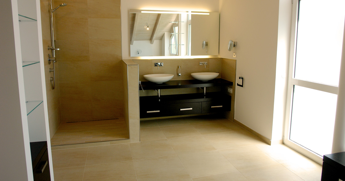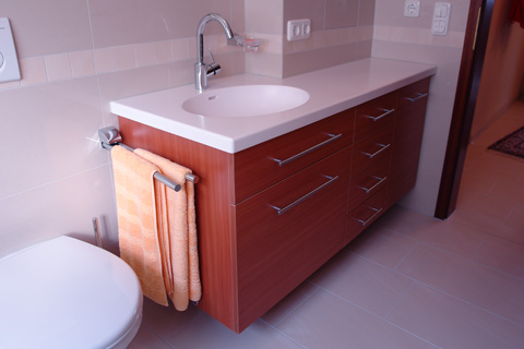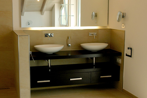 Ein modernes Bad mit viel freier Fläche und offenen Ablageflächen. Zum Stil des Bades passend wurde hier schwarzes Wengenholz verwendet.