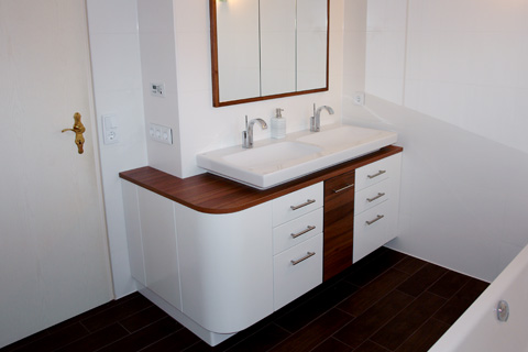 Beste Raumnutzung ist vor allem in Bädern oft essentiell. Für dieses Projekt haben wir uns entschieden den typischen Unterschrank zu modifizieren. Die stark abgerundete Kante bietet mehr Bewegungsfreiheit. Gleichzeitig konnte dadurch die Oberfläche des Waschtisches vergrößert werden, um mehr Ablagefläche zu bieten.