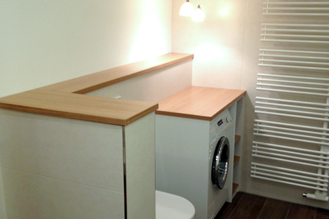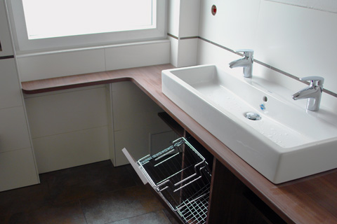 Abgerundete Ablageflächen und eine Sitzmöglichkeit werden hier zusätzlich durch einen ausklappbaren Wäschekorb ergänzt, so ist die Wäsche aufgeräumt und trotzdem leicht erreichbar.