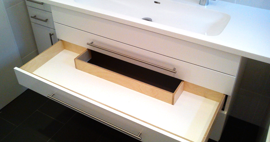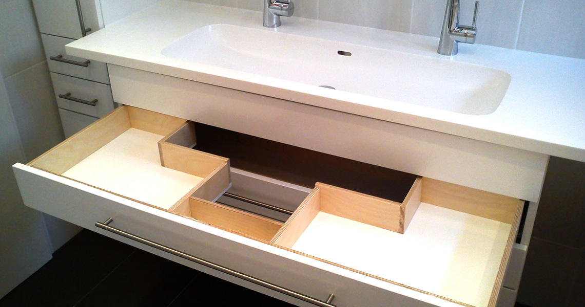 Stauraum im Bad ist oft ein Luxus und gerne wird viel Platz durch die Armaturen und Leitungen belegt. In dieser Individuallösung wurde der Schublade ein Ausschnitt für den Siphon eingebaut um das meiste aus den gegebenen Möglichkeiten zu holen.