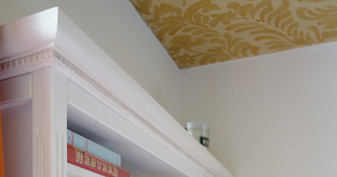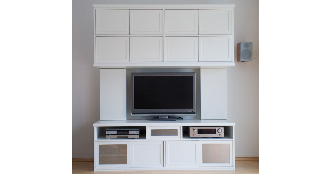 Da es bereits einen eigenen Stil mit den geschwungenen Türbögen besitzt, wurden die Schränke in Höhe und Stil entsprechend angepasst. Zusätzlich wurden Kabelschächte und Steckdosenleisten für die Multimedia-Geräte mit eingebaut.