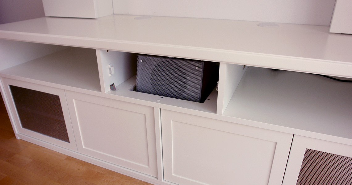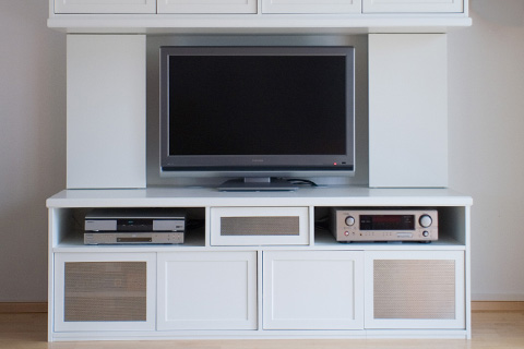 Wenn Technologie und Einrichtung verschmelzen. Diese Sonderanfertigung für einen Multimedia-Schrank ist speziell um die Geräte herum entwickelt. Sämtliche Kabelführungen laufen über spezielle Kabelkanäle.