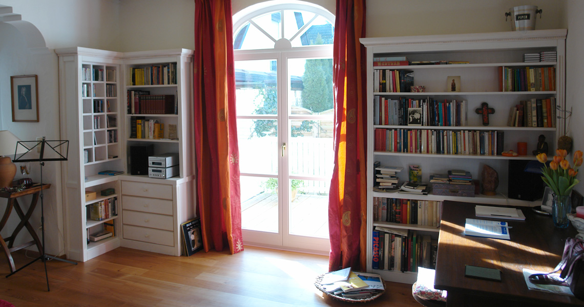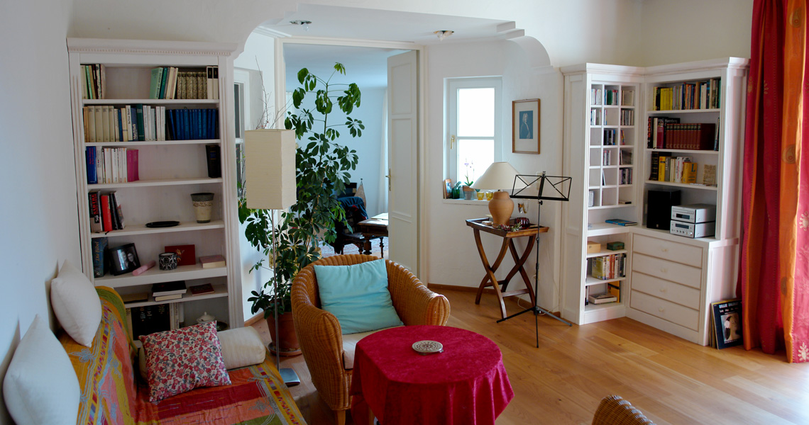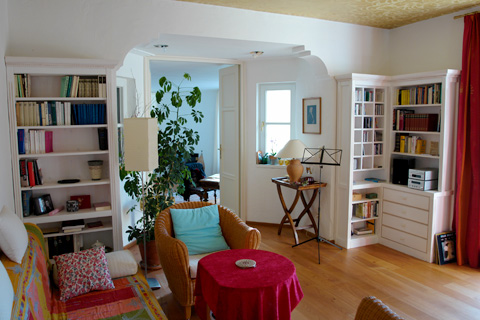 Dieses Zimmer wird zumeist zum Lesen oder Musizieren benutzt und bietet mit den neuen Schrankelementen genügend Platz für Bücher und Noten.