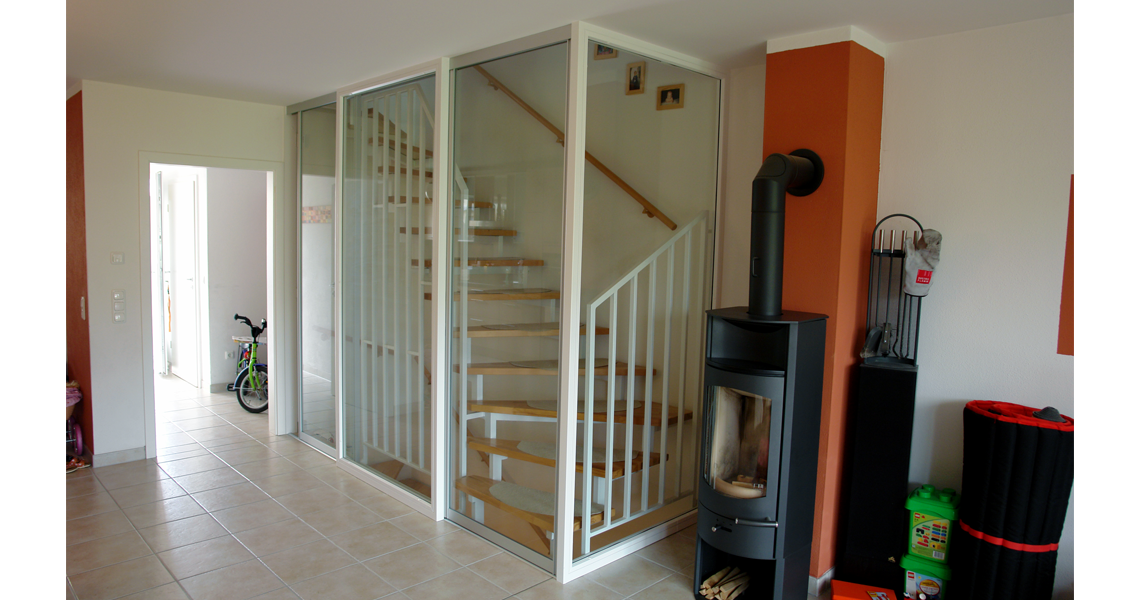 Bonuseffekte: Dank Sicherheitsglas ist für Lärmschutz auch direkt gesorgt und die Wärme des Ofens zieht nicht durchs Treppenhaus nach oben!