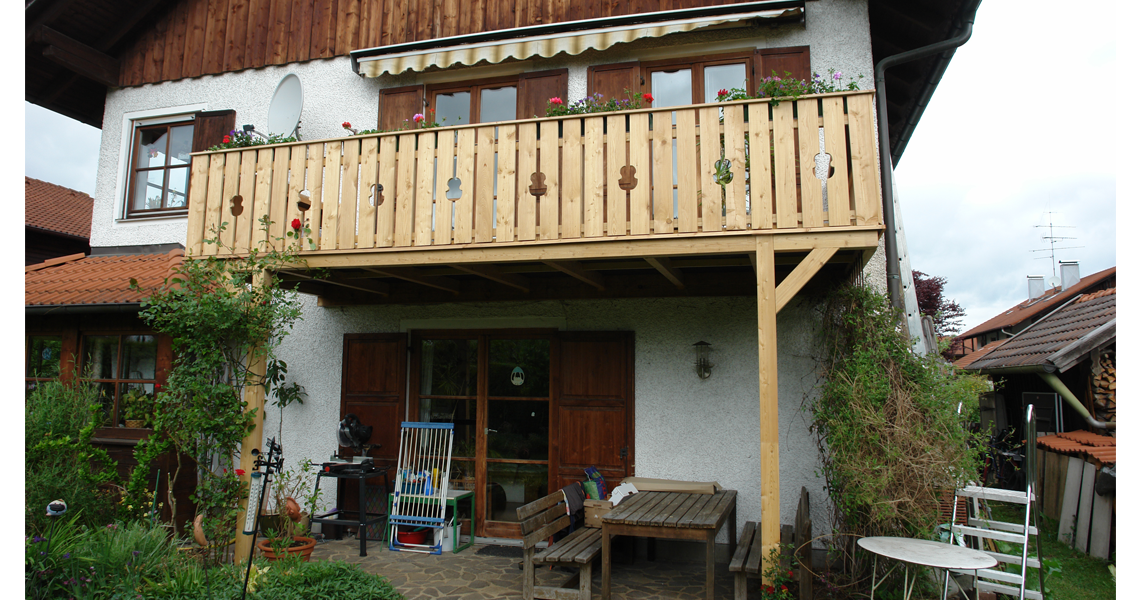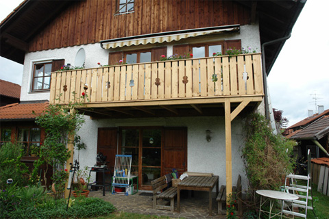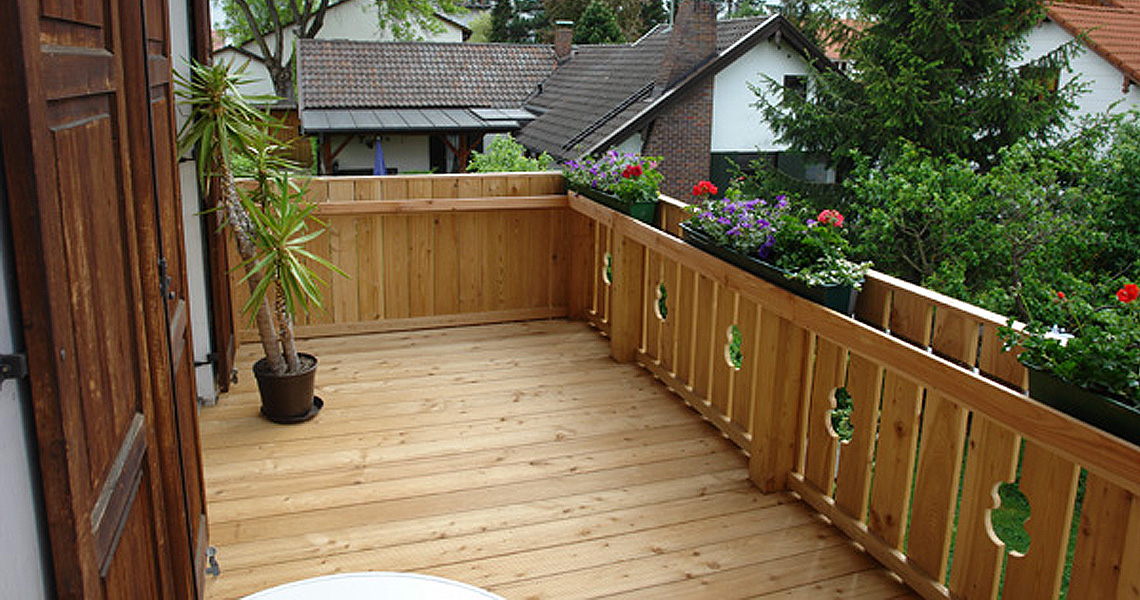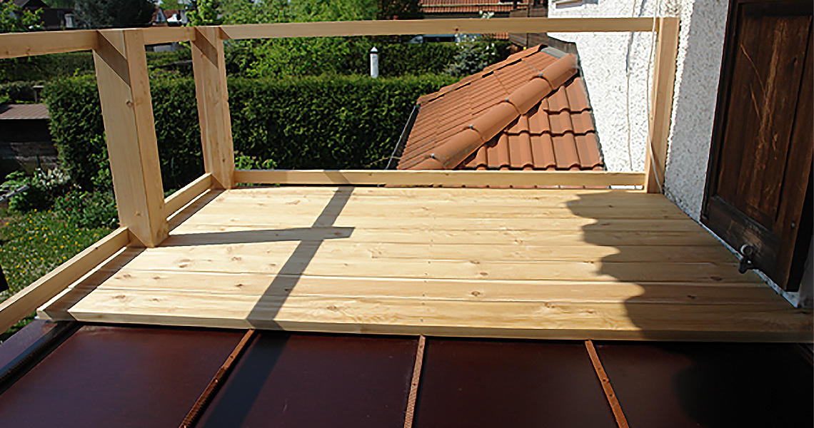 In diesen Vollholzbalkon wurde eine wasserdichte Platte eingelassen um die Terrasse darunter trocken zu halten. Die Bodendielen sind mit einem neuen PVC Wasserableitungssystem verschraubt, wodurch Regenwasser ungehindert auf der wasserdichten Platte abfließen und in einer Regentonne gesammelt werden kann.