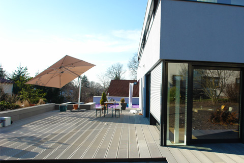 Ein modernes Haus benötigt auch eine moderne Terasse. Bei diesem Neubau mit großem Gartenbereich durfte es daher nicht irgend ein Material sein. Der deutsche Hersteller Megawood (www.megawood.com) bietet genau das richtige: Massive Barfußdielen aus einer Holz-Polymermischung - wiederstandsfähig, kratzfest, wetterfest und pflegeleicht.